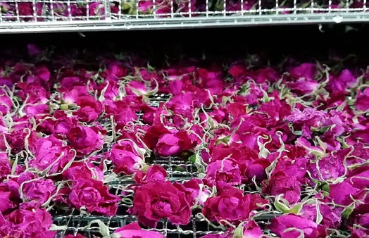干花蕾出炉:烘干车进入烘干室大约8小时,人工检测干花蕾,只要色泽鲜艳,具有玫瑰特有的香气,花蕾呈饱满纺锤形,颜色为紫红色或酱紫红色,花托、花萼为黄绿色,用手捻花蕾呈粉片状,花托70~80%的用手捻碎后