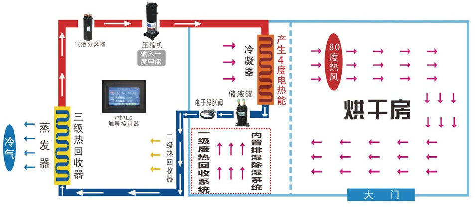 热泵烘干机是利用逆卡诺原理,吸收空气的热量并将其转移到房内,实现烘干房的温度提高,配合相应的设备实现物料的烘干。热泵烘干机由压缩机——换热器(内机)——节流器——吸热器(外机)——压缩机等装置构成了一个循环系统。冷媒在压缩机的作用下在系统内循环流动。它在压缩机内完成气态的升压升温过程(温度高达100℃),它进入内机释放出高温热量加热烘干房内空气,同时自己被冷却并转化为流液态,当它运行到外机后,液态迅速吸热蒸发再次转化为气态,同时温度下降至零下20℃—30℃,这时吸热器周边的空气就会源源不断地将热量传递给冷媒,冷媒不断地循环就实现了将空气中的热量搬运到烘干房内以烘干物料。